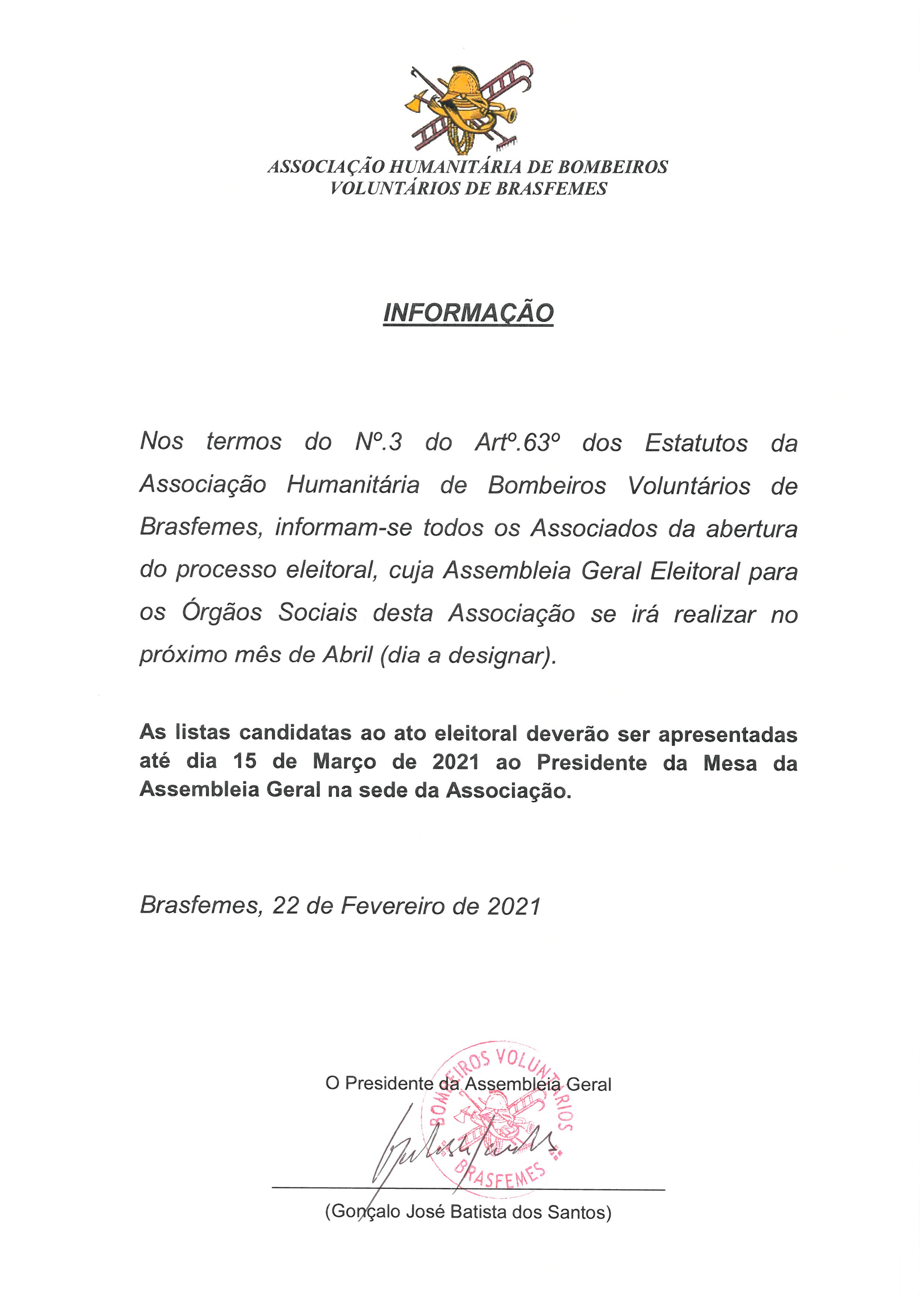 | Abertura de processo eleitoral para os Orgãos Sociais da Associação Humanitária de Bombeiros Voluntários de Brasfemes | Feb 22 2021 |